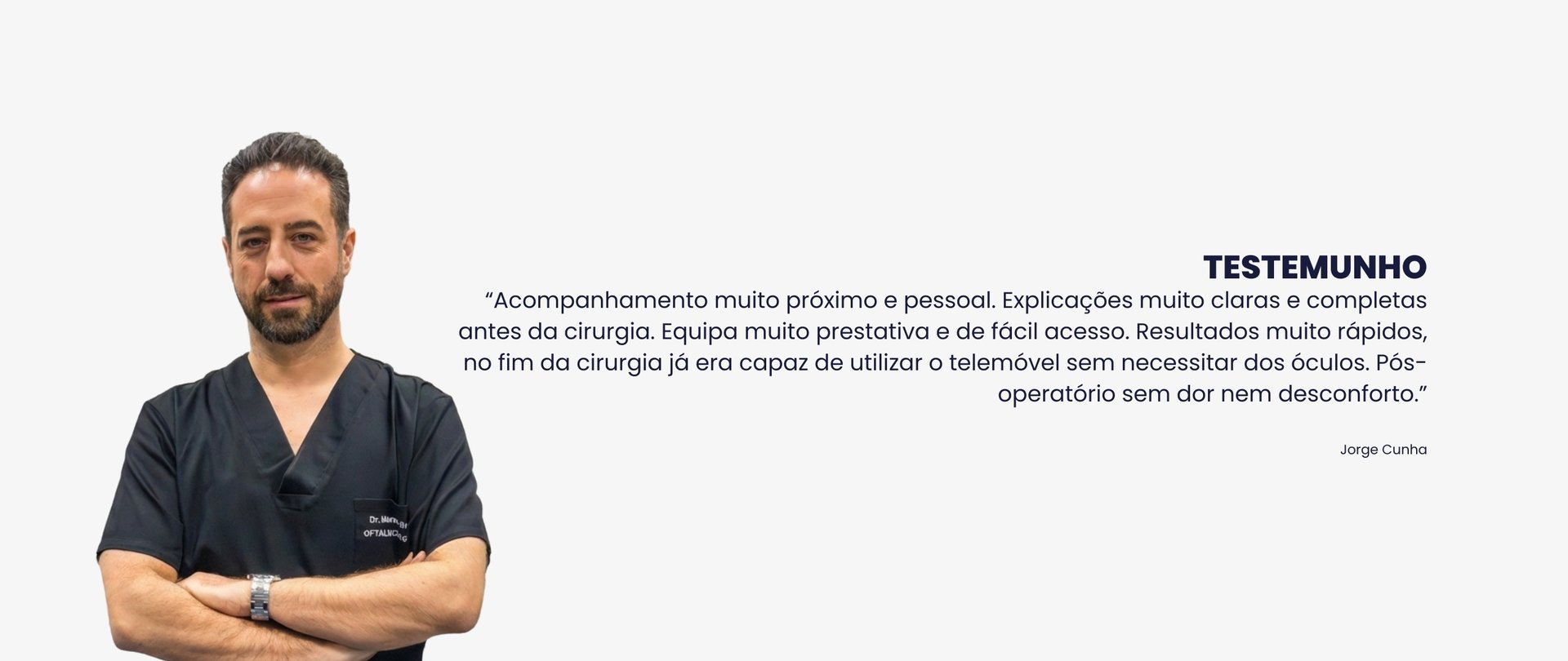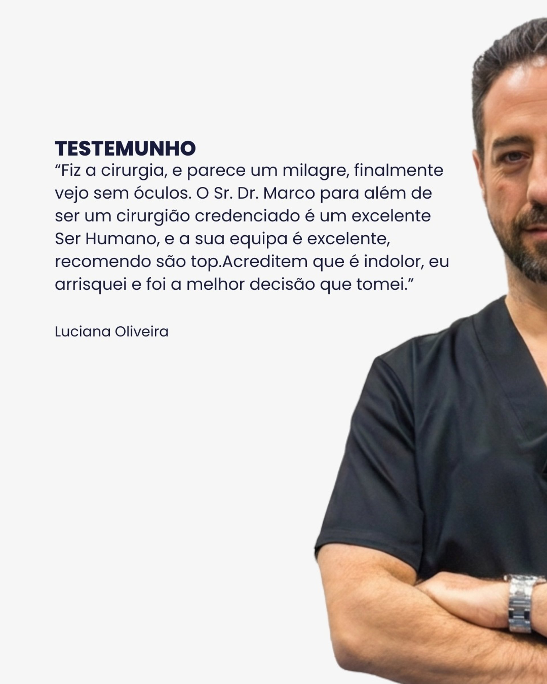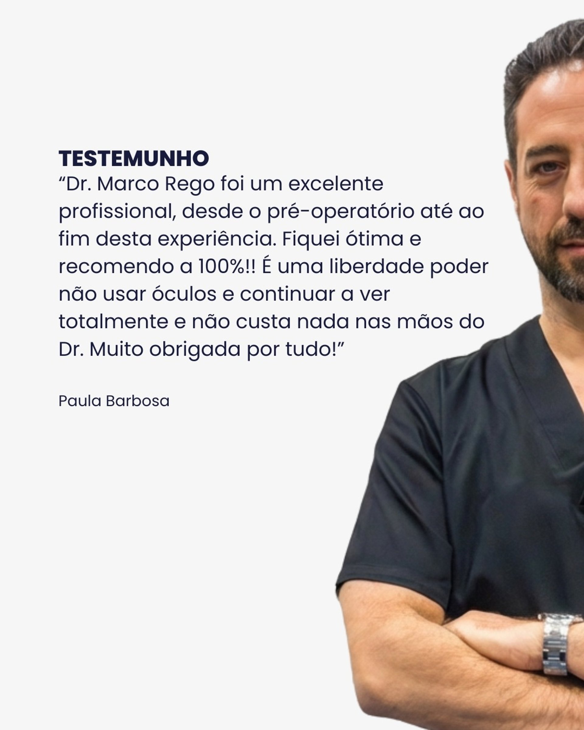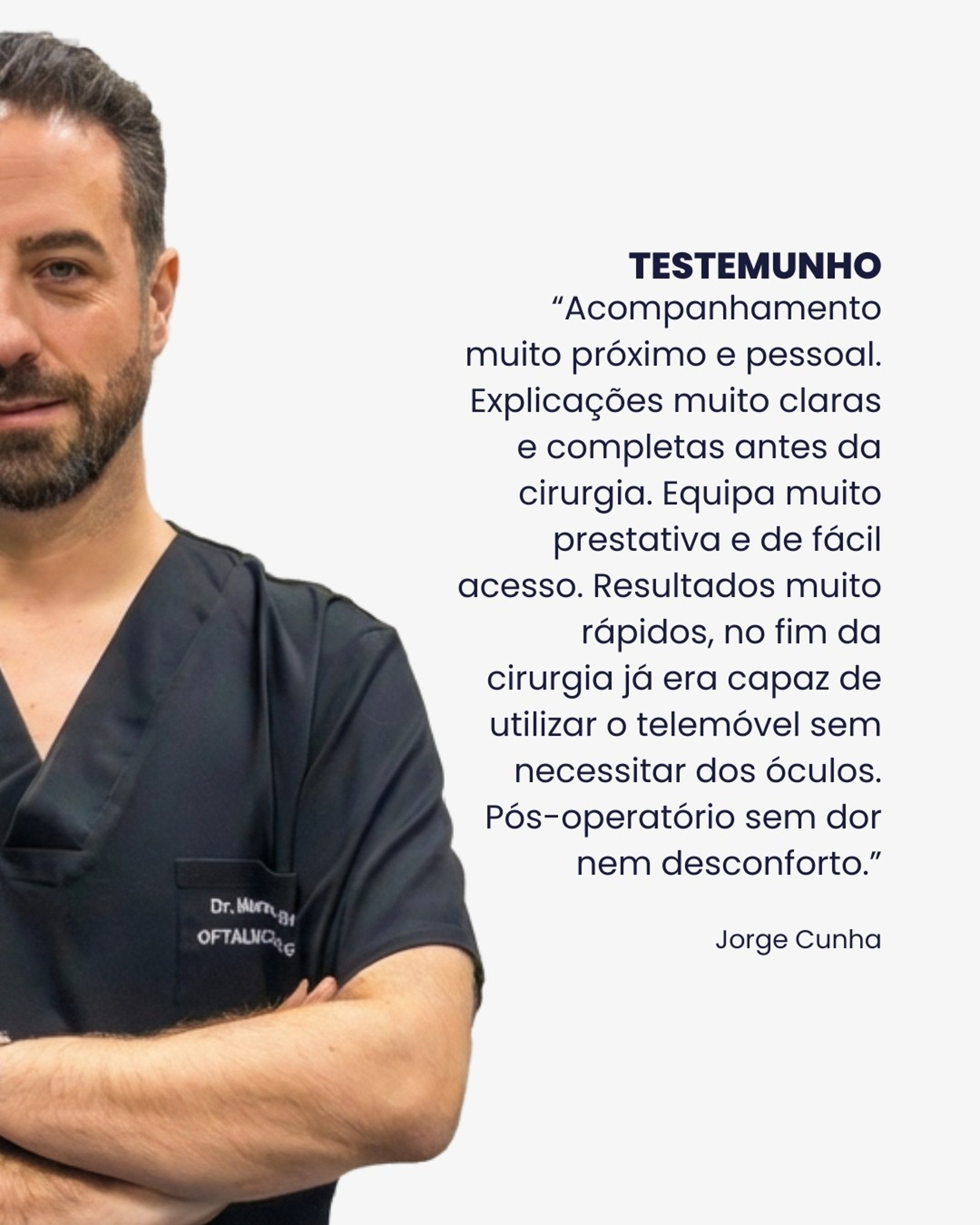"Acompanhamento muito próximo e pessoal. Explicações muito claras e completas antes da cirurgia. Equipa muito prestativa e de fácil acesso. Resultados muito rápidos, no fim da cirurgia já era capaz de utilizar o telemóvel sem necessitar dos óculos. Pós-operatório sem dor nem desconforto."
